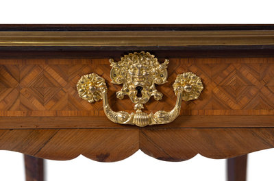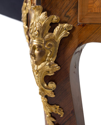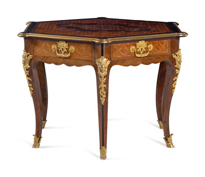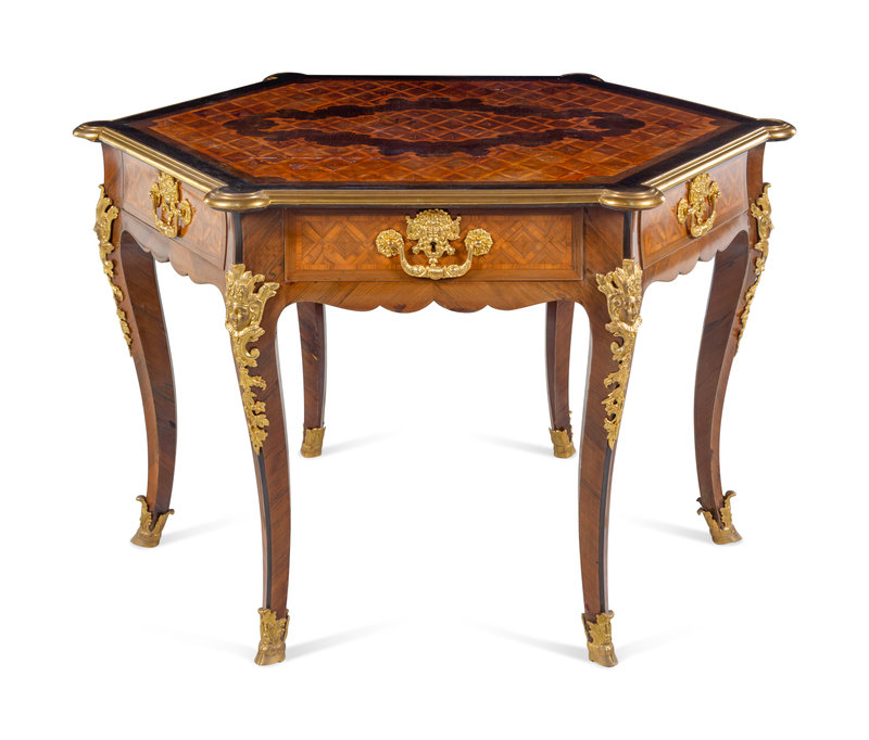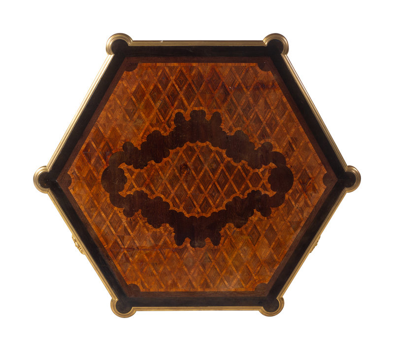 A Neoclassical Gilt Bronze Mounted Parquetry Hexagonal Center Table