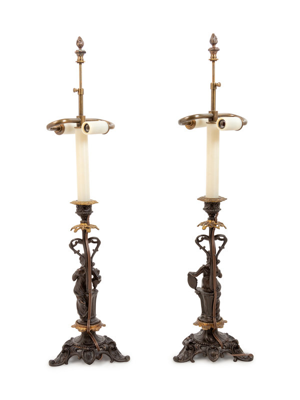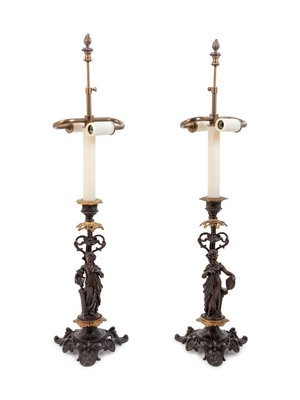 A Pair of French Gilt and Patinated Bronze Figures Mounted as Lamps