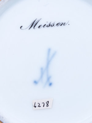 one example depicting Albrechtsburg Castle, the other depicting Putti Playing with a Goat after the work attributed to Charles-Dominique-Joseph Eisen (French, 1720-1778); each bearing crossed swords in underglaze blue to the underside.