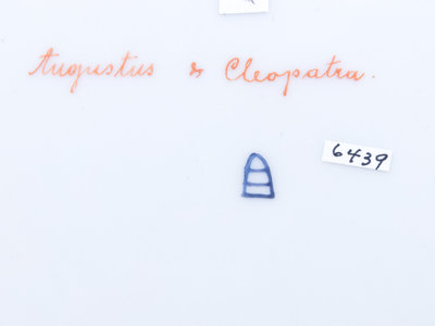 inscribed Augustus & Cleopatra and bearing a beehive mark in underglaze blue to the underside.