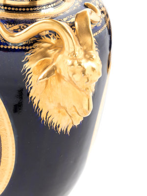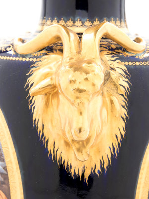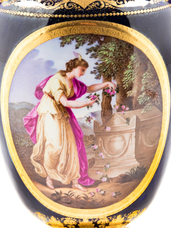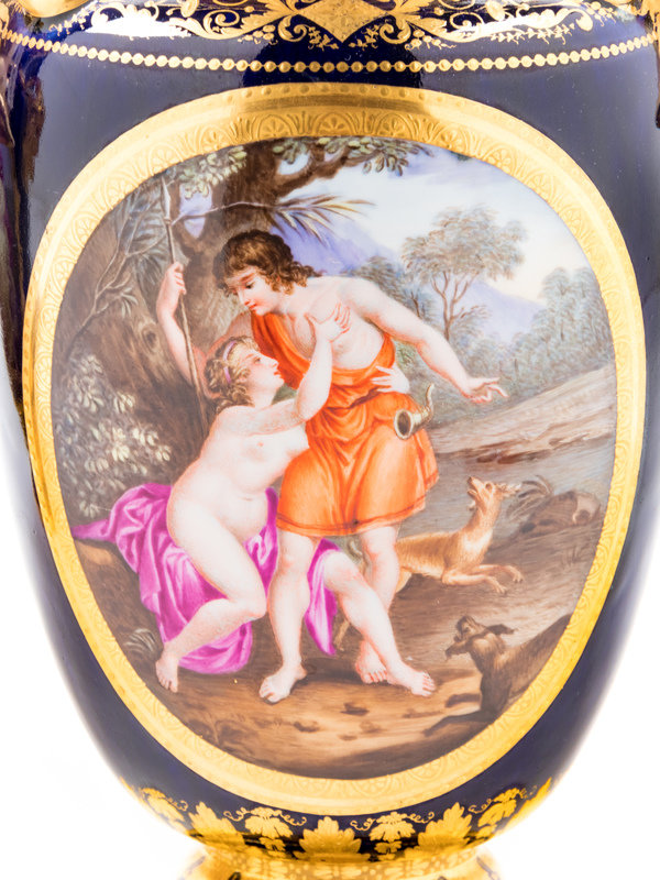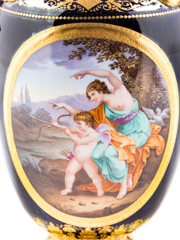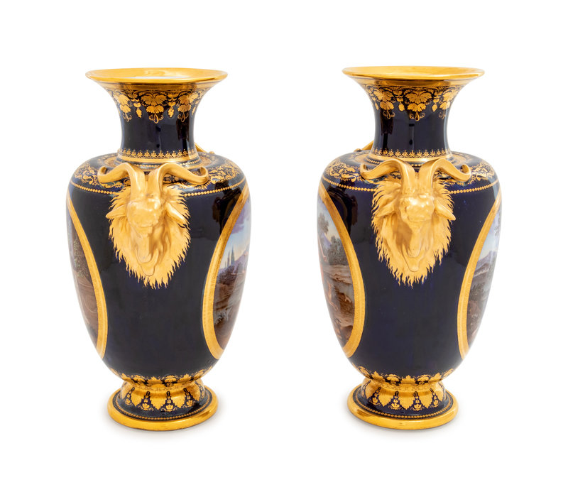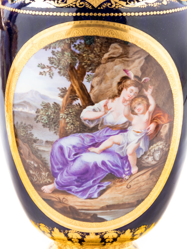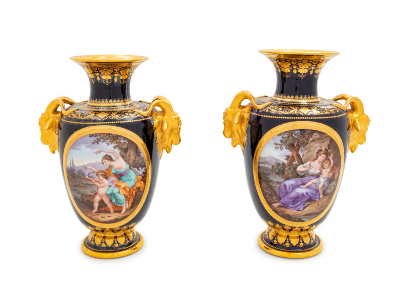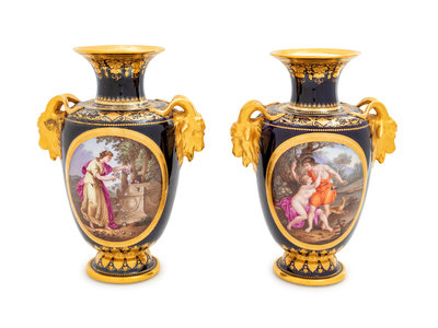 A Pair of Vienna Painted and Parcel Gilt Handled Porcelain Urns