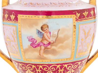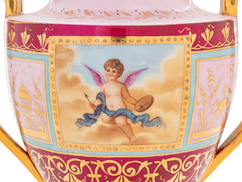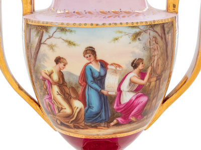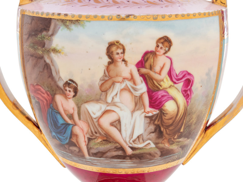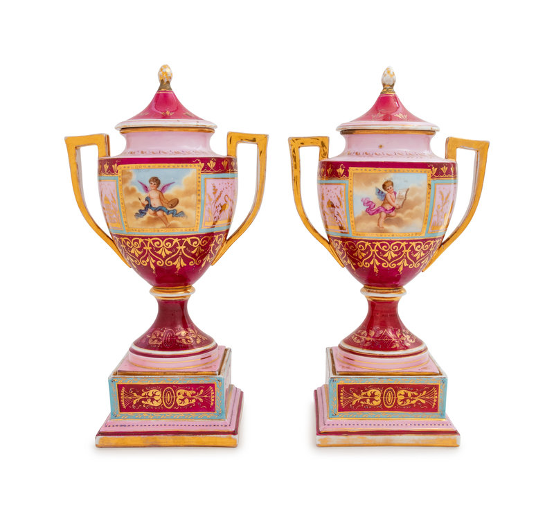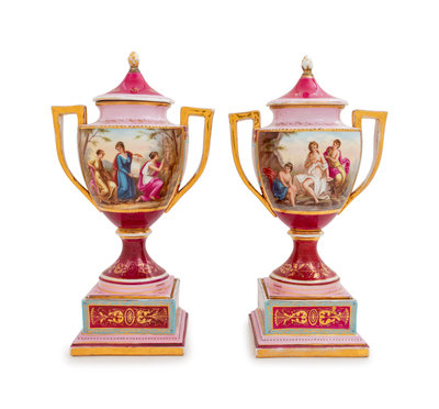 A Pair of Vienna Painted Porcelain Covered Urns and Stands