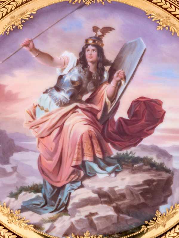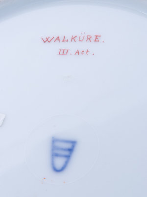 depicting Brünhilde, the painted scene signed indistinctly, the underside inscribed Walküre III Act. in iron red and bearing a beehive mark in underglaze blue to the underside.
