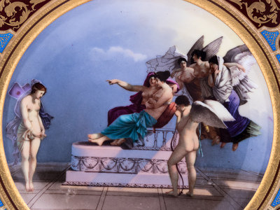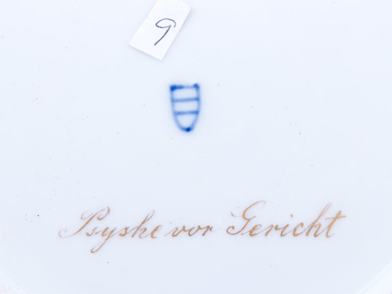 Psyche before the Court, inscribed Psyche vor Gericht in iron red and bearing a beehive mark in underglaze blue to the underside.