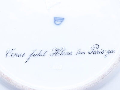 Venus Leading Helena to Paris, inscribed Venus führt Helena Im Paris zu and bearing a beehive mark in underglaze blue to the underside.