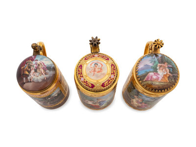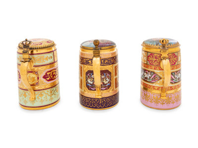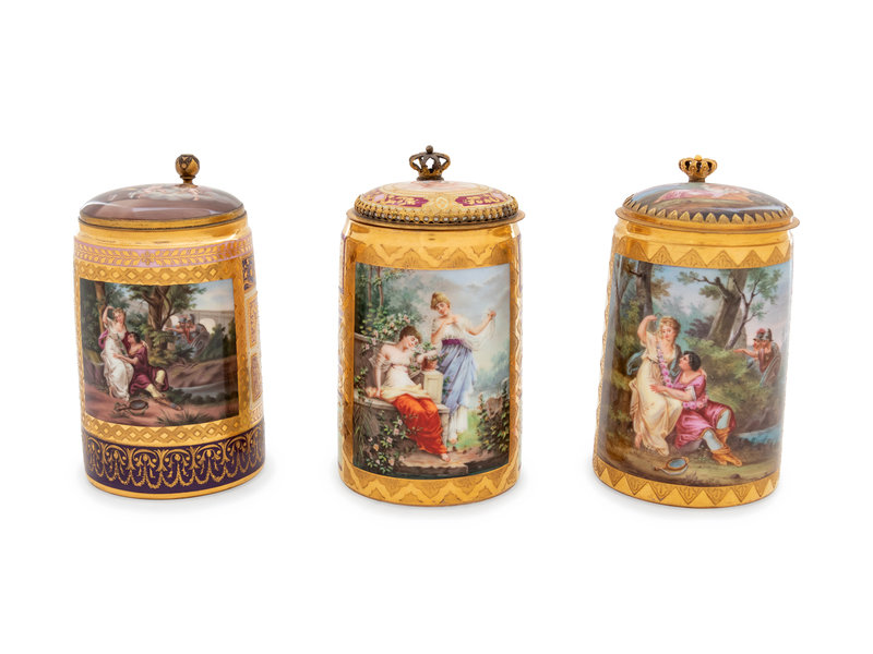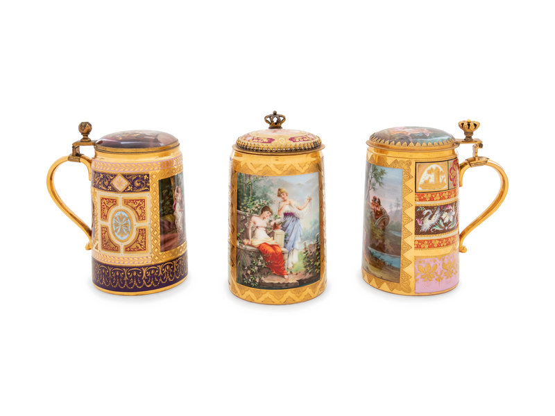 Three Vienna Painted and Parcel Gilt Porcelain Tankards