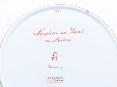 Napoleon im Kreml zu Moskau (Napoleon in the Moscow Kremlin), titled, numbered 8833 and marked Germany in underglaze red, further bearing a beehive mark in iron red and impressed HL/M.