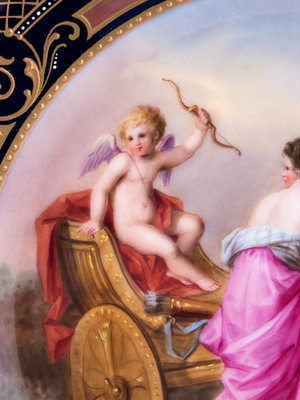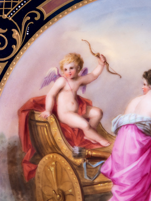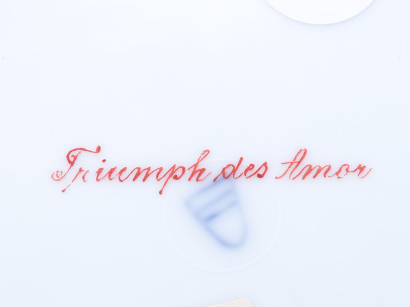 Triumph des Amor, the painted scene signed L. Teichel, bearing a beehive mark in underglaze blue to the underside.