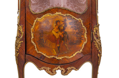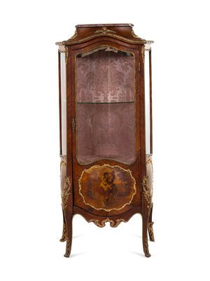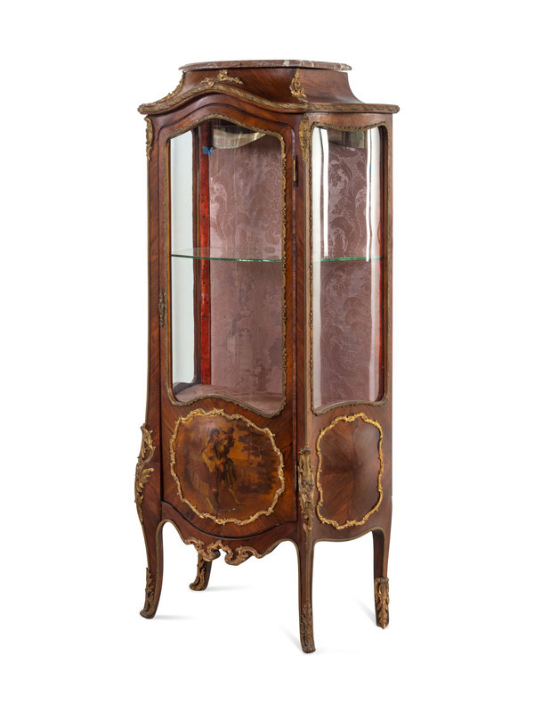 A Louis XV Style Gilt Bronze Mounted Kingwood and Vernis Martin-Decorated Marble-Top Vitrine Cabinet