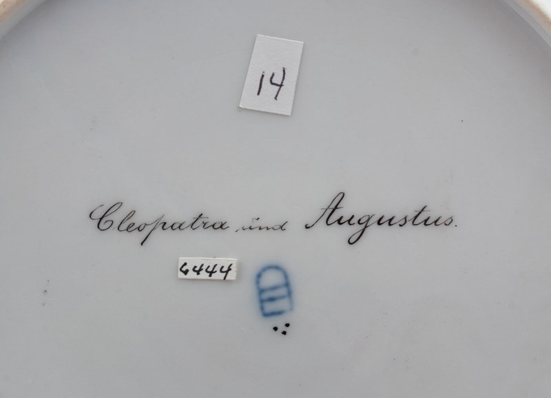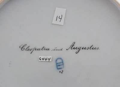 inscribed Cleopatra und Augustus, bearing a beehive mark in underglaze blue to the underside.