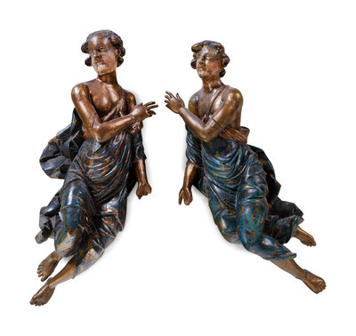 A Pair of Continental Polychrome Painted and Parcel Gilt Carved Wood Figures
