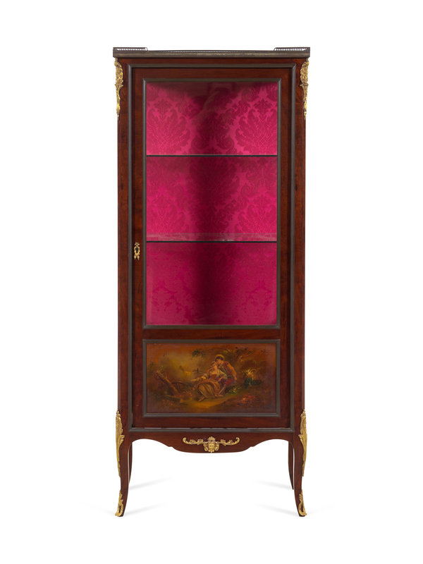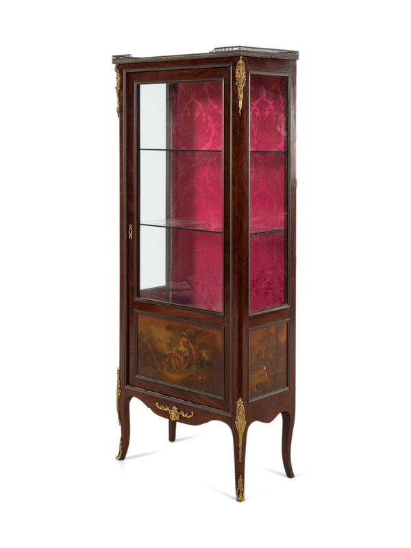 A Louis XV Style Gilt Bronze Mounted Vernis Martin-Decorated Mahogany Marble-Top Vitrine Cabinet