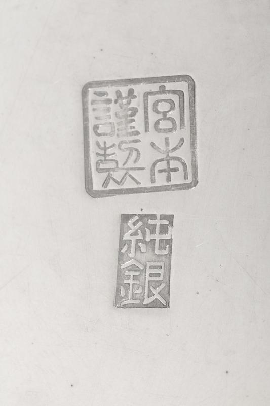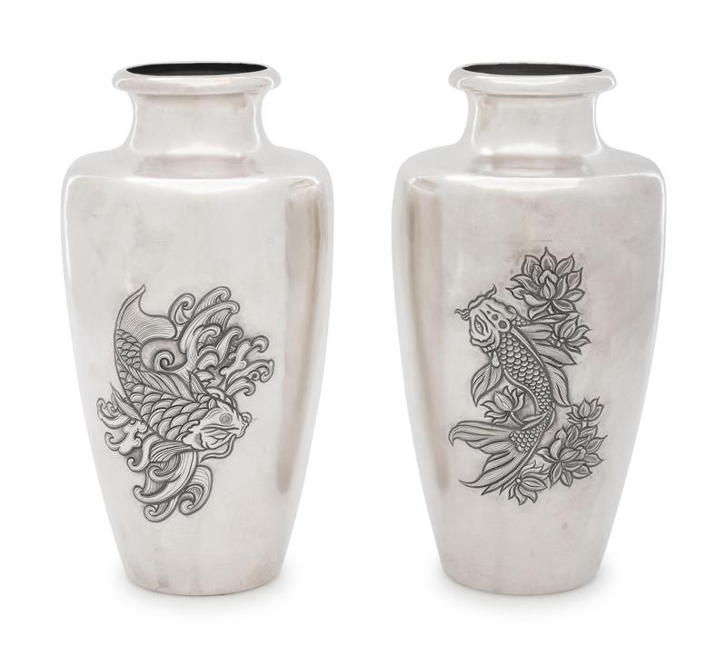 each with repoussé fish decoration and a three-character mark to the reverse.