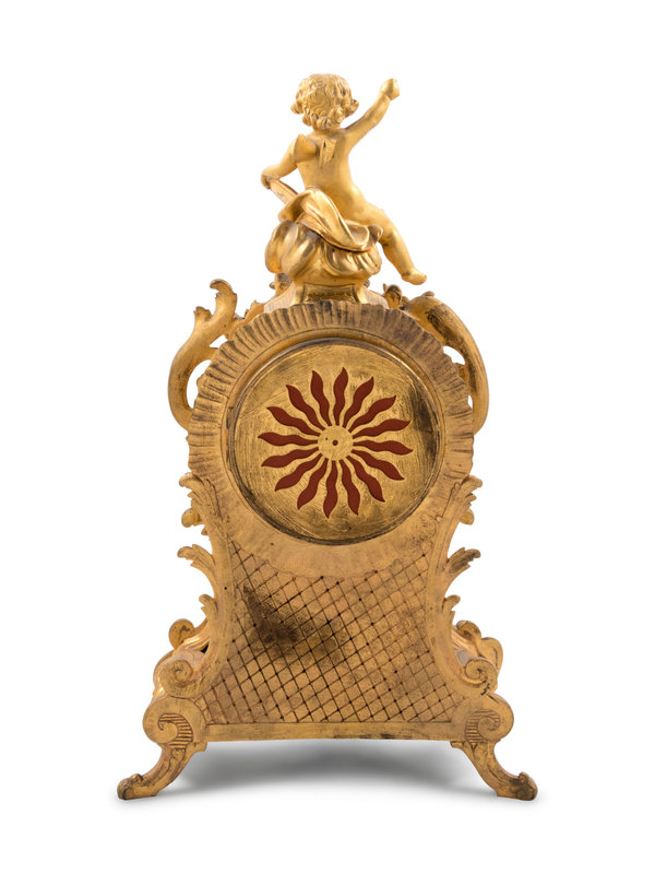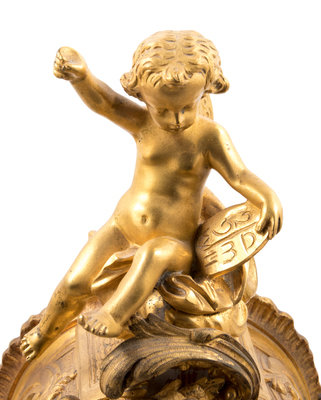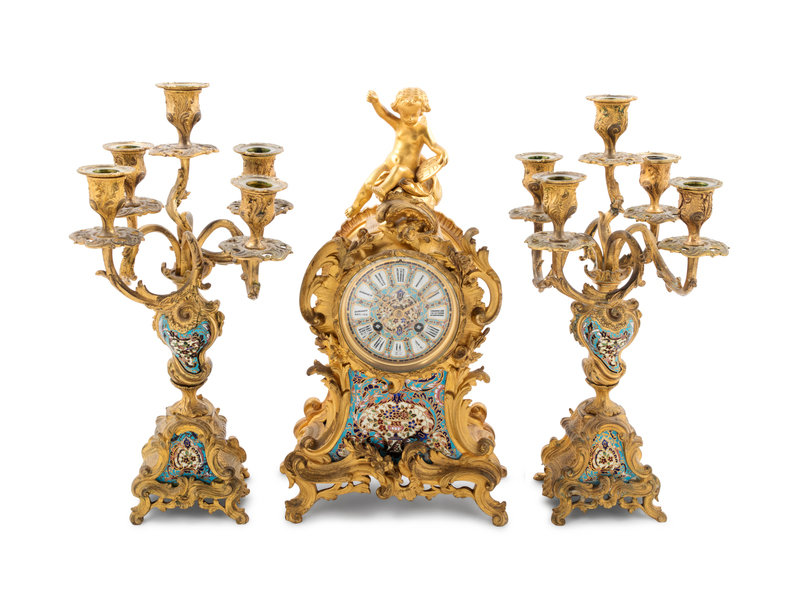 A Louis XV Style Gilt Bronze and Champlevé Enamel Clock Garniture