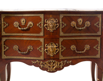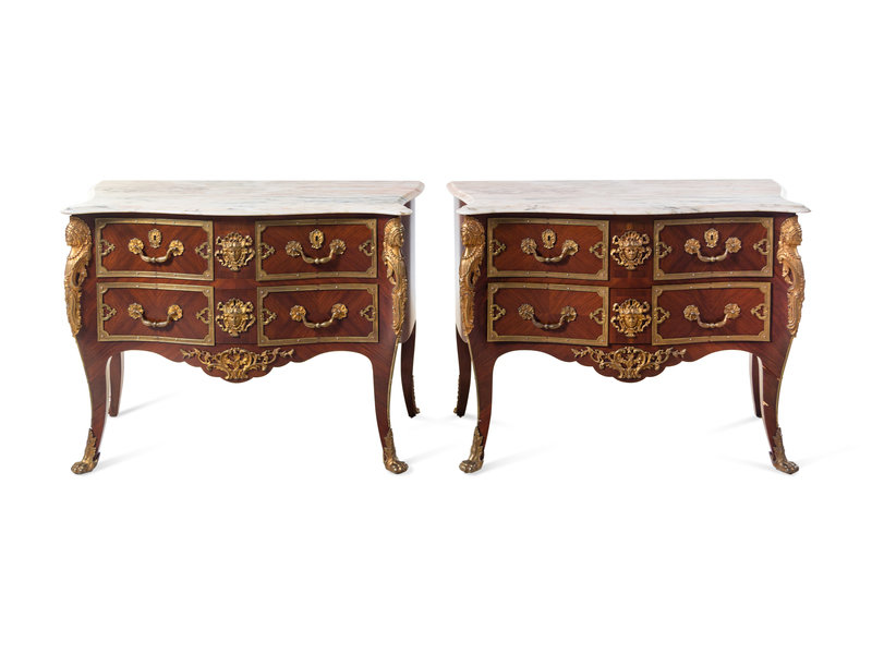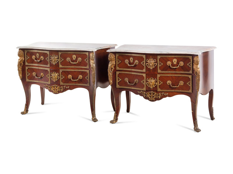 A Pair of Régence Style Gilt Bronze Mounted Marble-Top Commodes