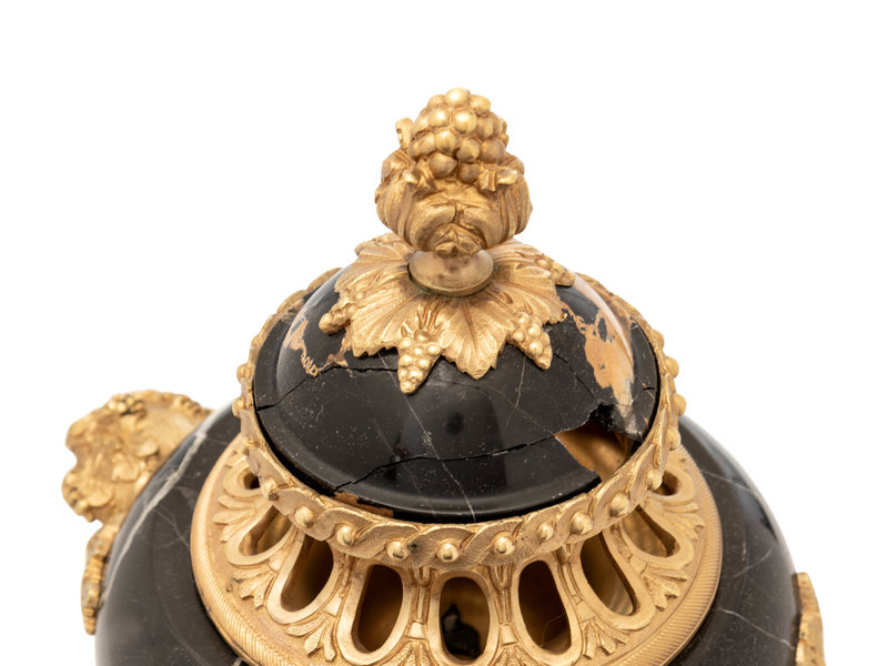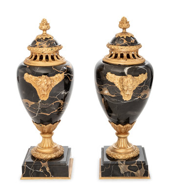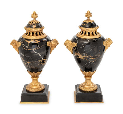 A Pair of Louis XV Style Gilt Bronze Mounted Marble Covered Urns
