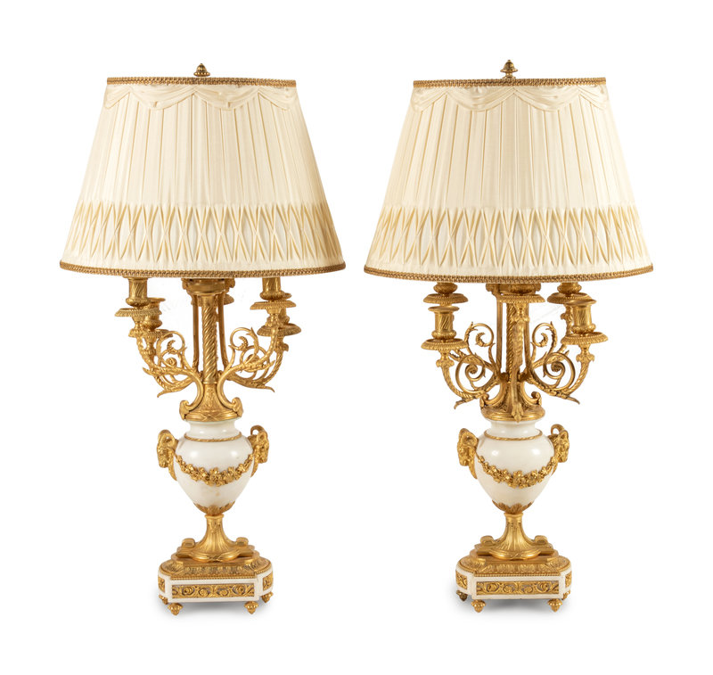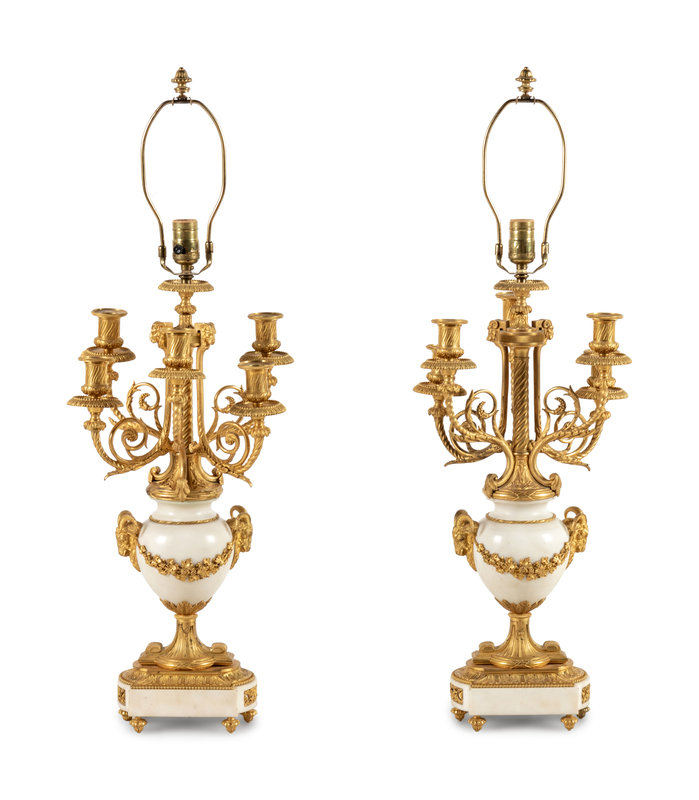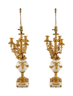 A Pair of Louis XVI Style Gilt Bronze and White Marble Six-Light Candelabra