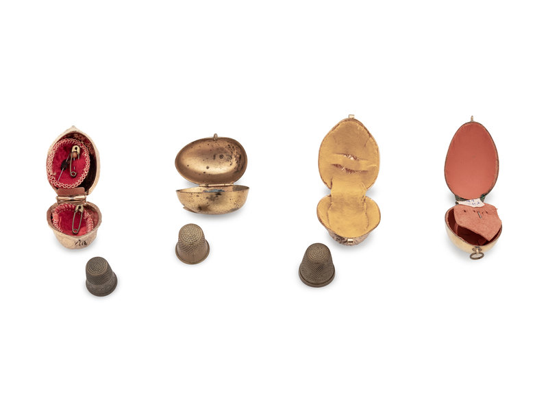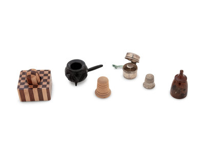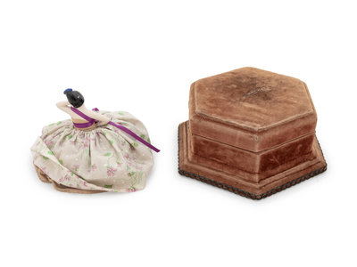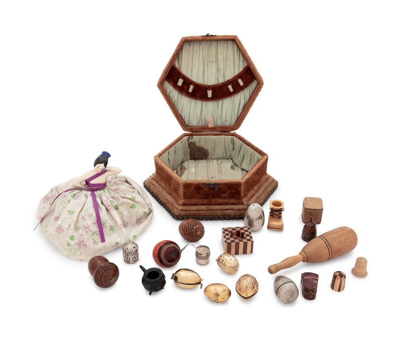 A Velvet-Clad Needlework Box, a Porcelain "Doll" Pin Cushion and a Collection of Thimble Cases