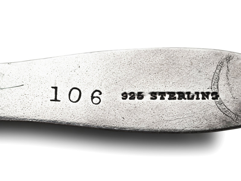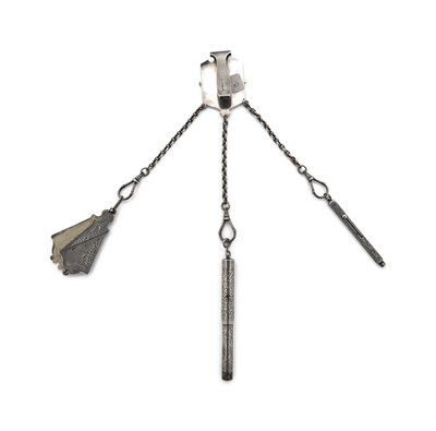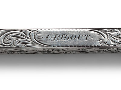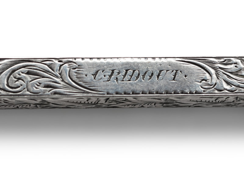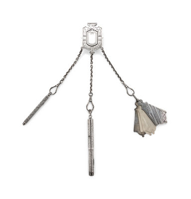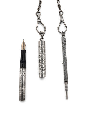 the engraved clip suspending a notepad, a fountain pen and a retractable pencil.