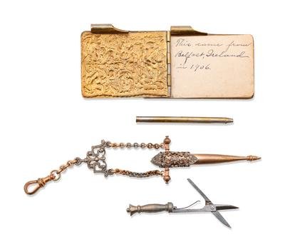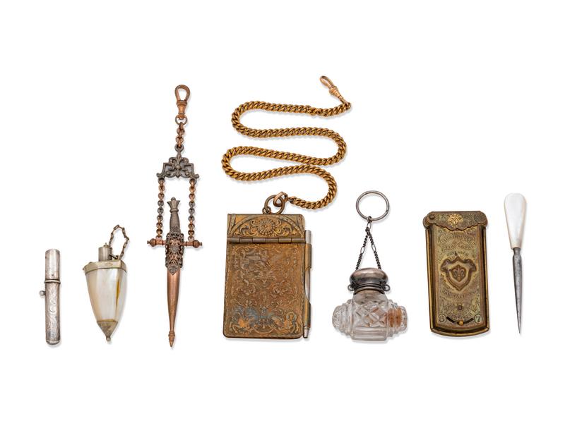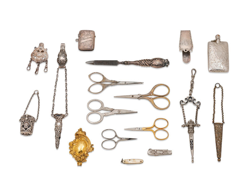 A Collection of Silver Chatelaine Articles, Needlework Scissors and Other Tools