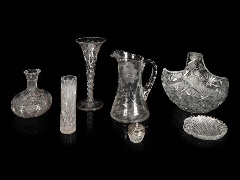 comprising 3 vases, a basket, a pitcher, a bon bon dish and a silvered metal mounted mustard pot.
