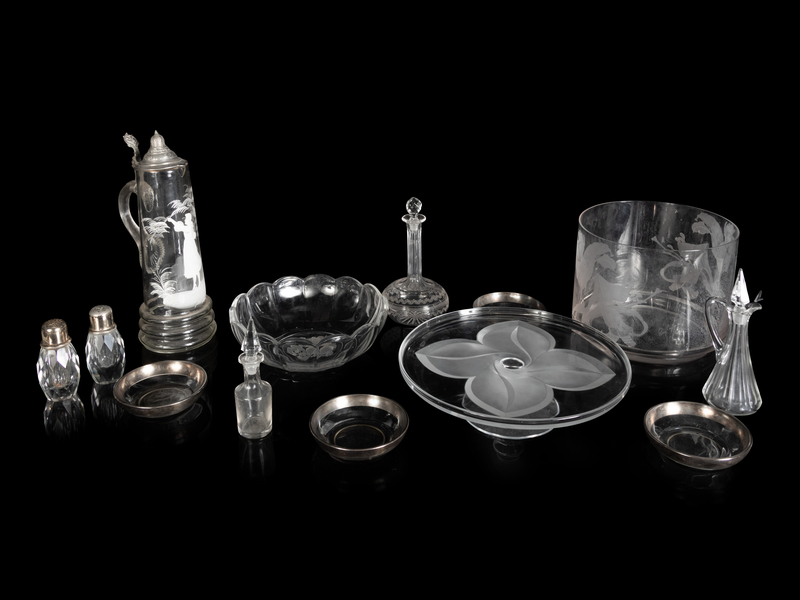 comprising an ewer, 3 decanters, a salt and pepper set, 4 small dishes, a cake stand, a jardinière and a bowl.