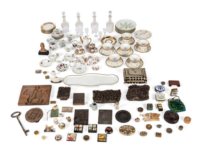 A Box Lot Containing a Collection of Wooden Molds, Porcelain Articles, and a Set of Glass Decanters with Cordials