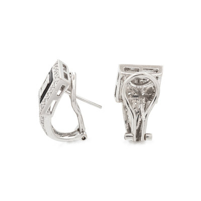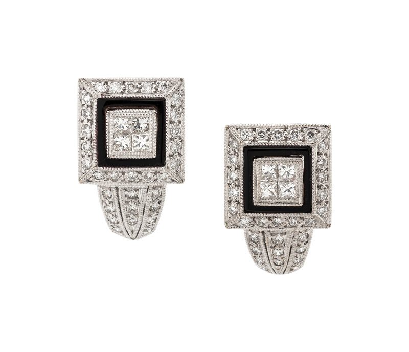 Containing eight princess cut diamonds weighing approximately 0.30 carat total, 62 round brilliant cut diamonds weighing approximately 0.25 carat total and black enamel detail, posts with clip backs. Mounted in white gold.