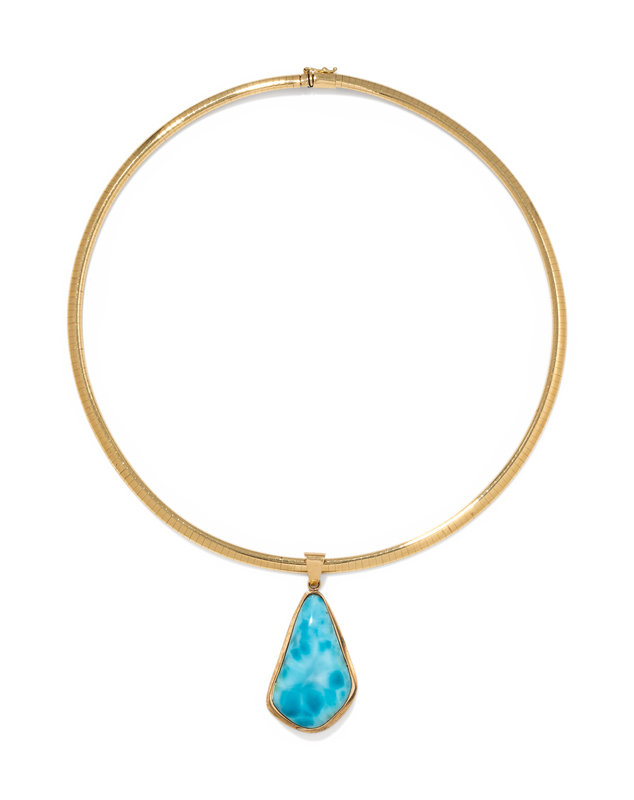 Consisting of a pendant containing one freeform larimar measuring approximately 36.00 x 22.00 mm, suspended from an omega chain measuring approximately 4.10 mm wide.