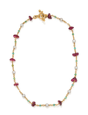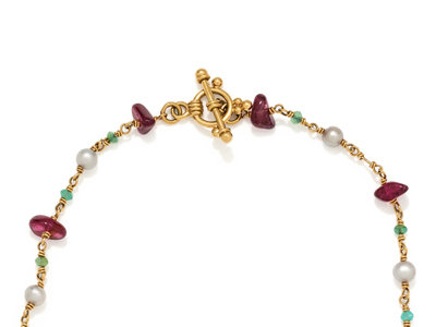 Containing 10 tumbled pink tourmaline beads, 16 faceted green gemstone beads and nine cultured pearls.