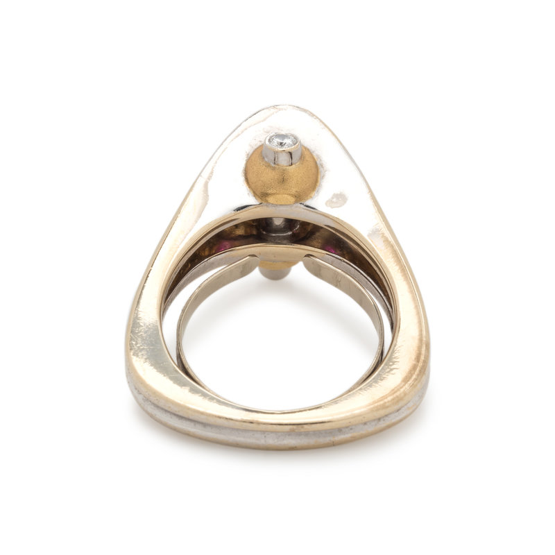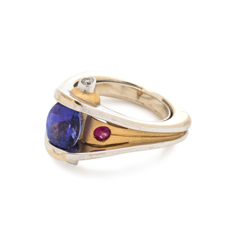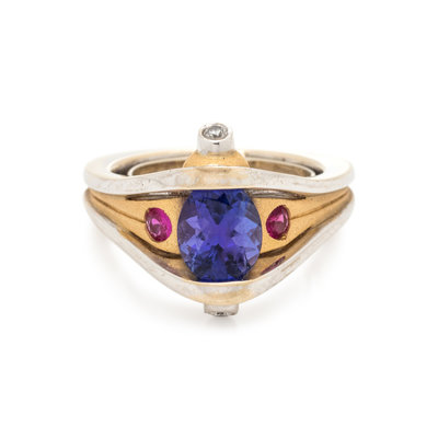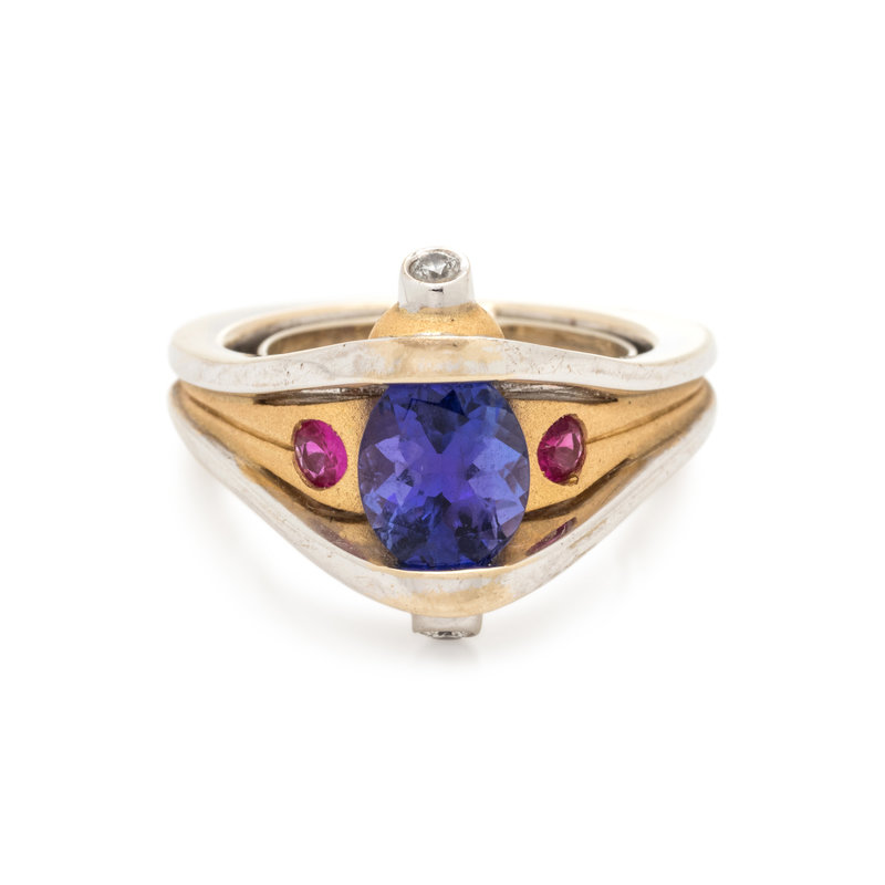 Containing one oval mixed cut tanzanite measuring approximately 8.50 x 6.90 mm, two round mixed cut rubies measuring approximately 2.90 mm in diameter and two round brilliant cut diamonds weighing approximately 0.06 carat total. Mounted in bicolor gold.