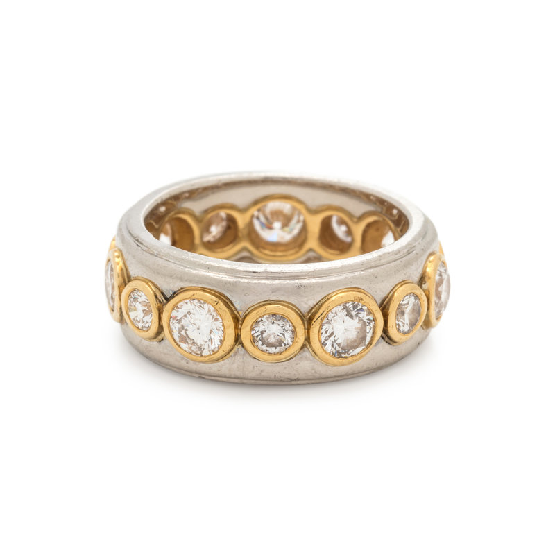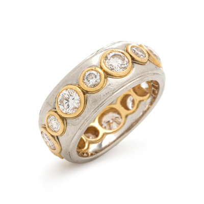 Containing 14 round brilliant cut diamonds weighing approximately 1.60 carats total. Mounted in platinum and yellow gold. Ring size 6 1/4.