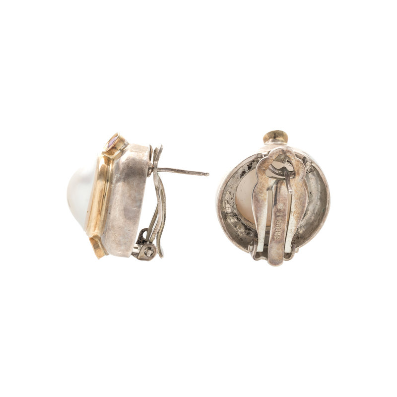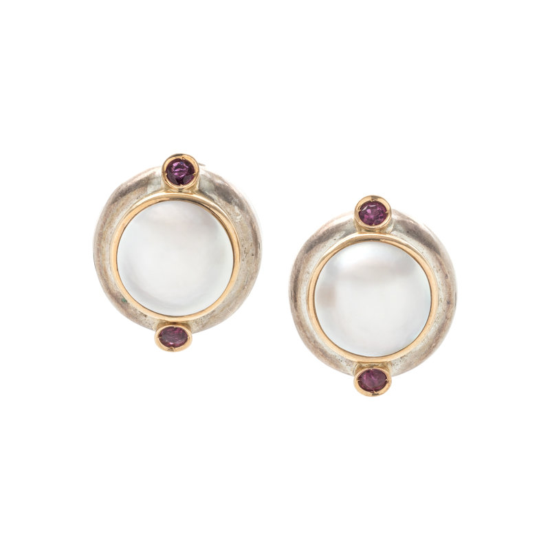 STERLING SILVER, YELLOW GOLD, CULTURED MABE PEARL AND RUBY EARCLIPS
