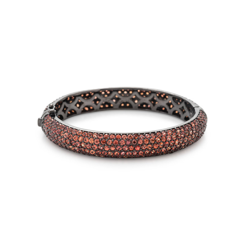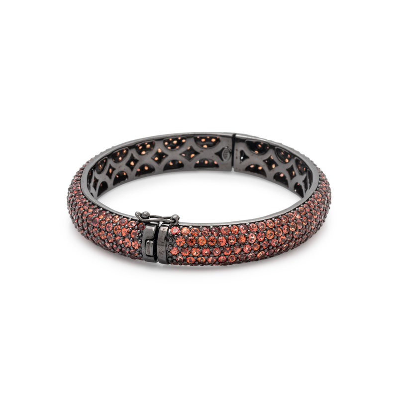 Containing numerous round mixed cut colored sapphires measuring approximately 2.20 mm in diameter, hinged with side clasp. Mounted in blackened silver.