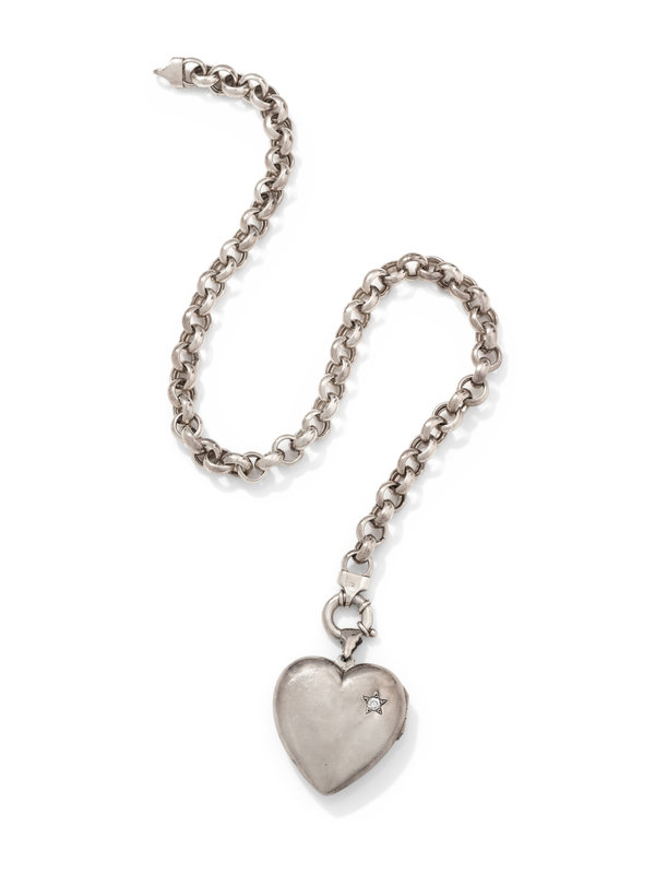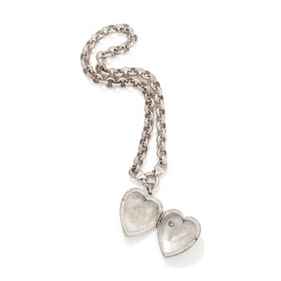 Consisting of a hinged heart locket containing one diamond simulant, suspended from a rolo chain necklace.