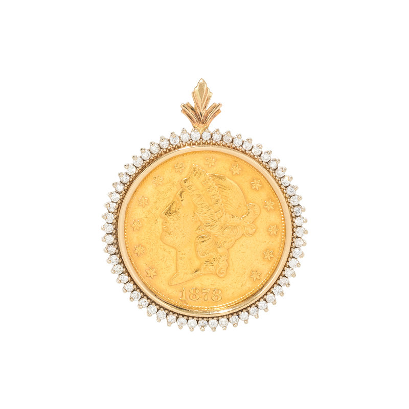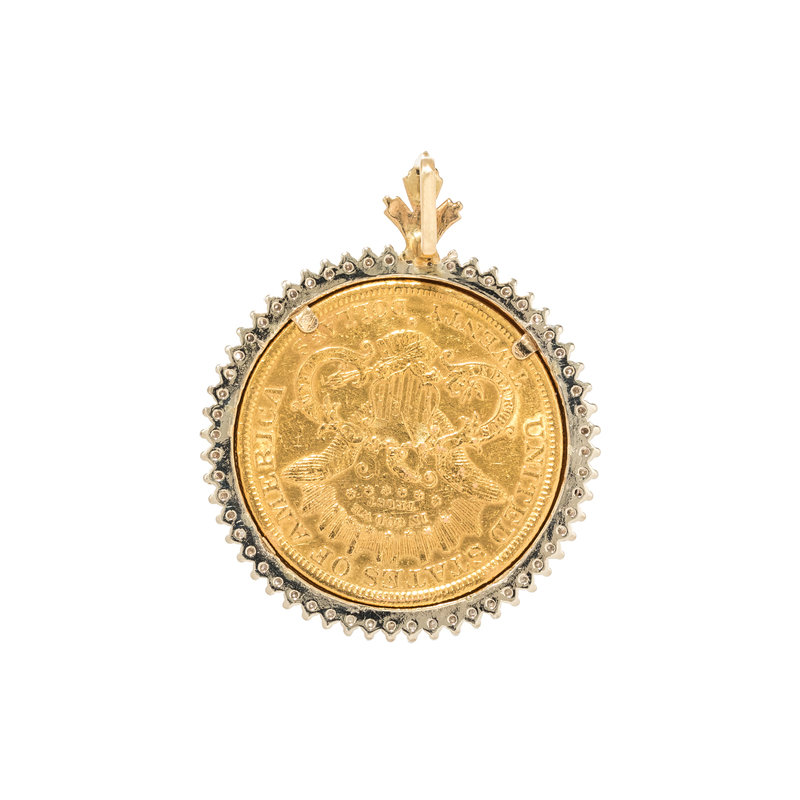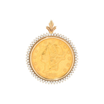 Containing one US Liberty $20 coin, dated 1878, with bicolor gold surround containing 56 round brilliant cut diamonds weighing approximately 1.50 carats total.