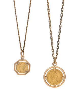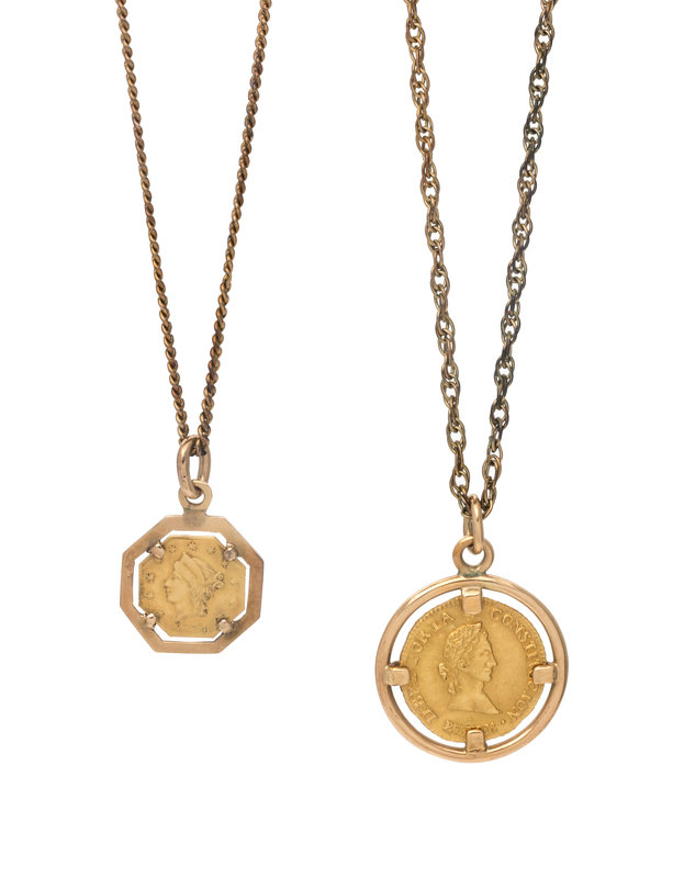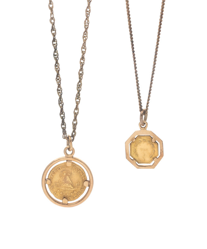 Consisting of a yellow gold pendant containing one Bolivian 1/2 Escoudo coin, dated 1843, together with a yellow gold pendant containing one US 1/4 dollar Liberty coin, dated 1854, together with two gold-filled chains.