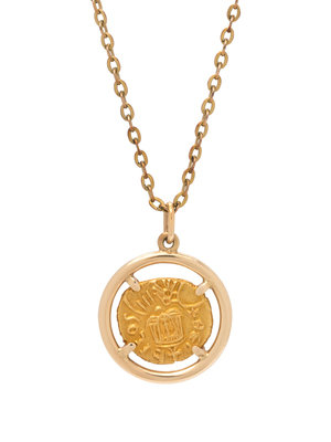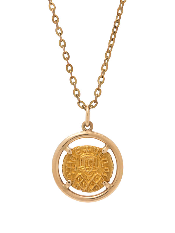 Consisting of a yellow gold pendant containing one Byzantine 1 Solidus Theophilus coin, 9th Century A.D., together with a gold-filled chain.