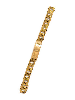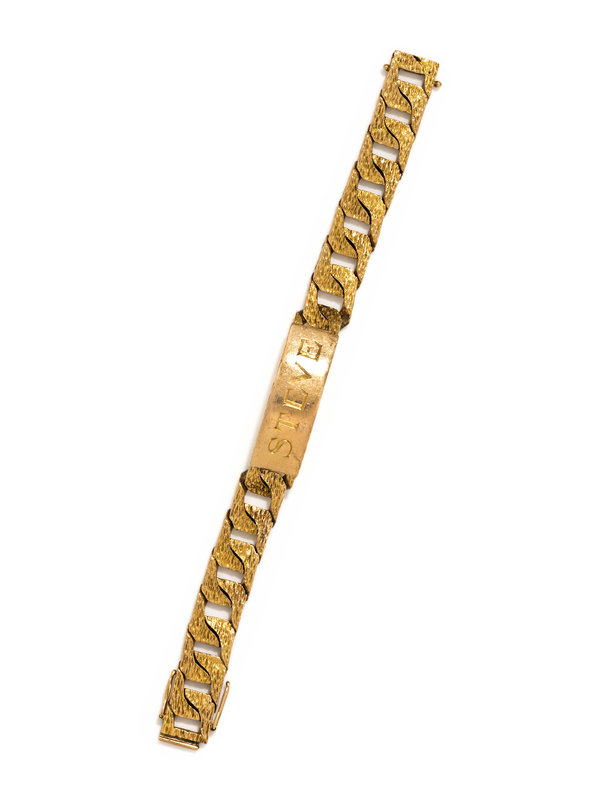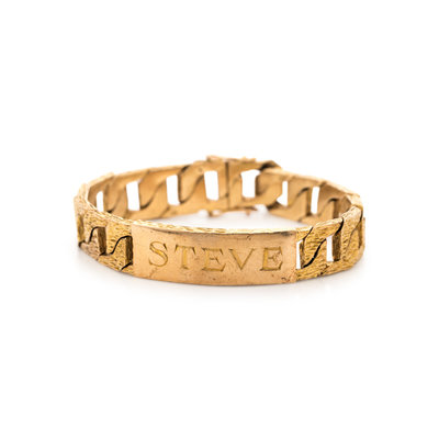 Consisting of a textured flattened curb link chain and curved plaque with 'STEVE' engraving.