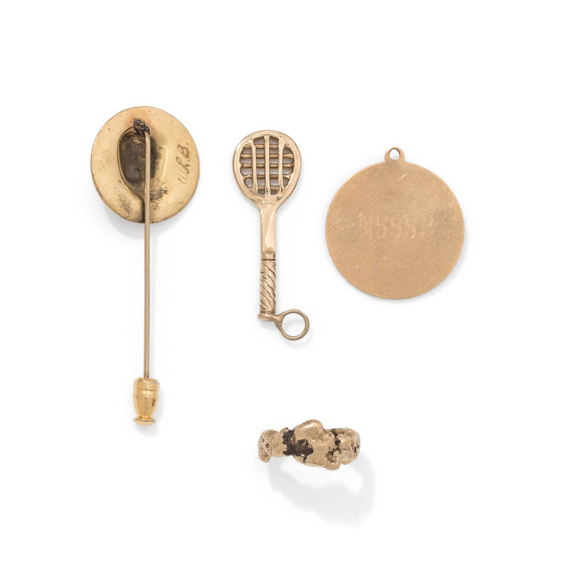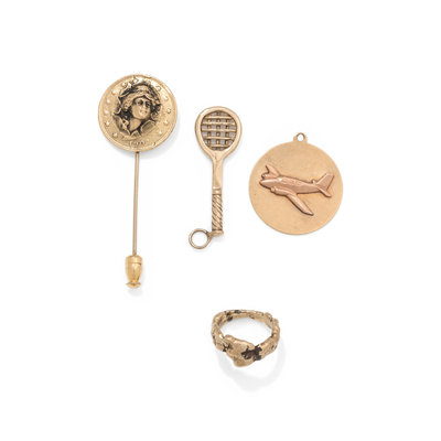 Consisting of a yellow gold disc pendant surmounted with a rose gold airplane, a tennis racket pendant, a stick pin depicting a repousse Liberty coin dated 1907, together with a gold nugget ring.
