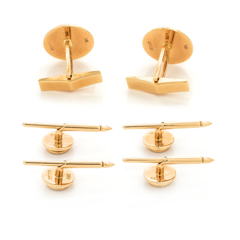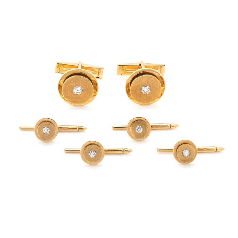 Consisting of a pair of cufflinks and three shirt studs containing six round brilliant cut diamonds weighing approximately 0.70 carat total.