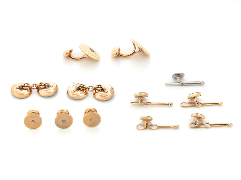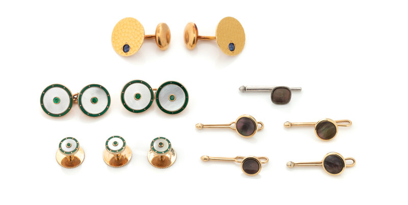 Consisting of a pair of yellow gold hammered cufflinks containing two round mixed cut sapphires measuring approximately 3.20 mm in diameter, a 9 karat gold British dress set consisting of a pair of cufflinks containing four round green gemstones within mother-of-pearl plaques with green enamel detail and three matching shirt studs, together with three yellow gold shirt studs by Krementz containing round mother-of-pearl plaques measuring approximately 7.70 mm in diameter, a yellow gold shirt stud by Krementz containing a round mother-of-pearl plaque measuring approximately 6.30 mm in diameter, together with a white gold shirt stud containing one cushion mother-of-pearl plaque measuring approximately 6.70 x 6.70 mm.
