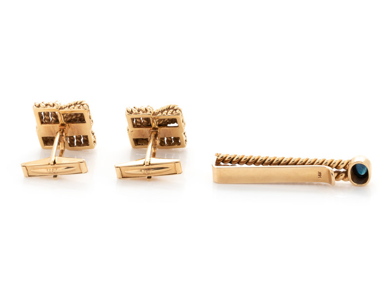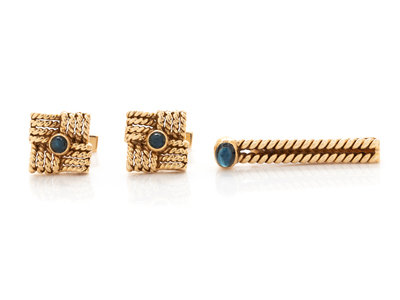 YELLOW GOLD AND SAPPHIRE CUFFLINKS AND TIE BAR SET