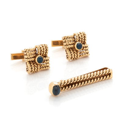 Consisting of a pair of twisted gold wire cufflinks containing two round cabochon sapphires measuring approximately 4.30 mm in diameter, together with a matching tie bar containing one oval cabochon sapphire measuring approximately 6.80 x 5.40 mm.