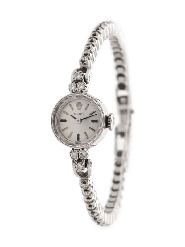 The lugs containing six round brilliant cut diamonds weighing approximately 0.24 carat total, 15.00 mm case diameter, matte silvered dial, baton numerals, manual wind 17 jewel movement signed ROLEX, bracelet containing numerous single cut diamonds, fold over clasp.