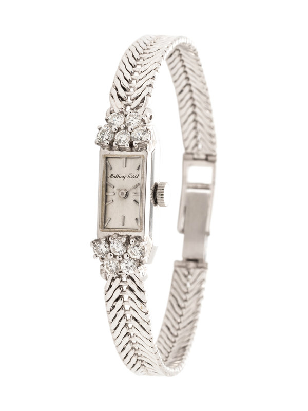 The lugs containing 10 round brilliant cut diamonds weighing approximately 0.80 carat total, 23.00 x 10.00 mm case dimensions, matte silvered dial, baton numerals, 17 jewel manual wind movement signed MATHEY-TISSOT, with a link bracelet measuring approximately 6.00-7.00 mm wide, fold over clasp.