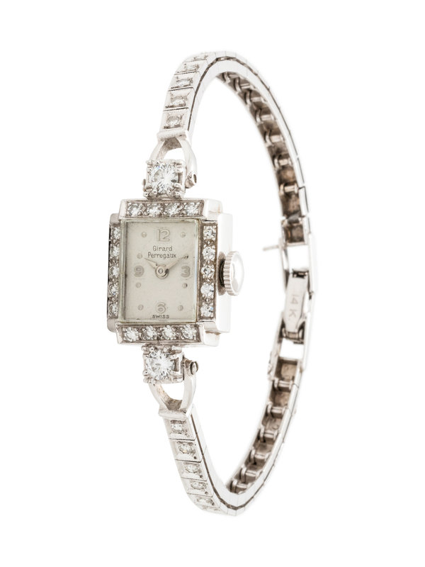 The bezel and lugs containing two round brilliant cut diamonds weighing approximately 0.30 carat total and 18 single cut diamonds, matte silvered dial, white gold dot and Arabic numerals, 17 jewel manual wind movement signed Girard-Perregaux & Co, with white gold bracelet containing 10 single cut diamonds, fold over clasp with safety chain.