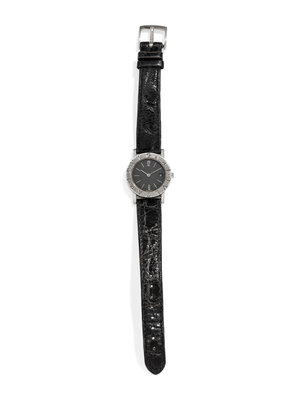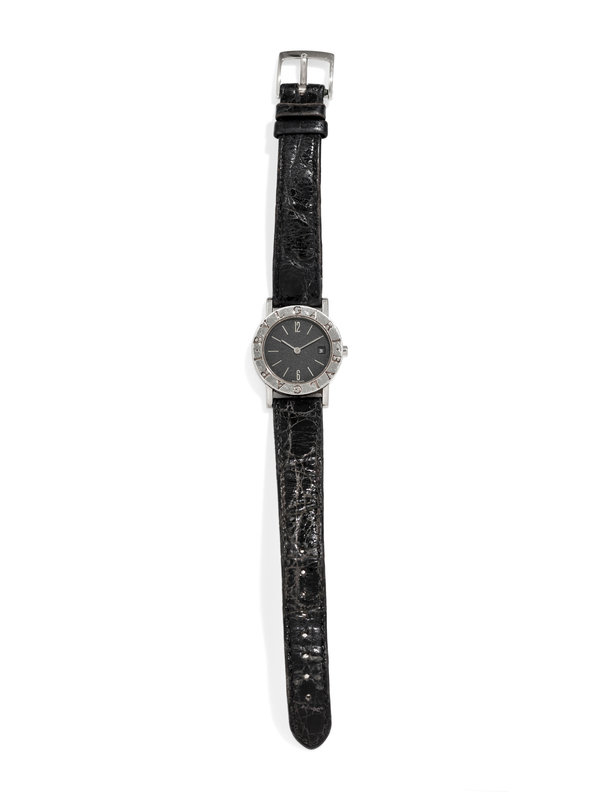 26.00 mm case diameter, black dial, steel baton and Arabic numerals, date aperture at 3 o'clock, bezel signed BVLGARI, quartz movement, black leather strap, steel tang buckle signed BVLGARI.