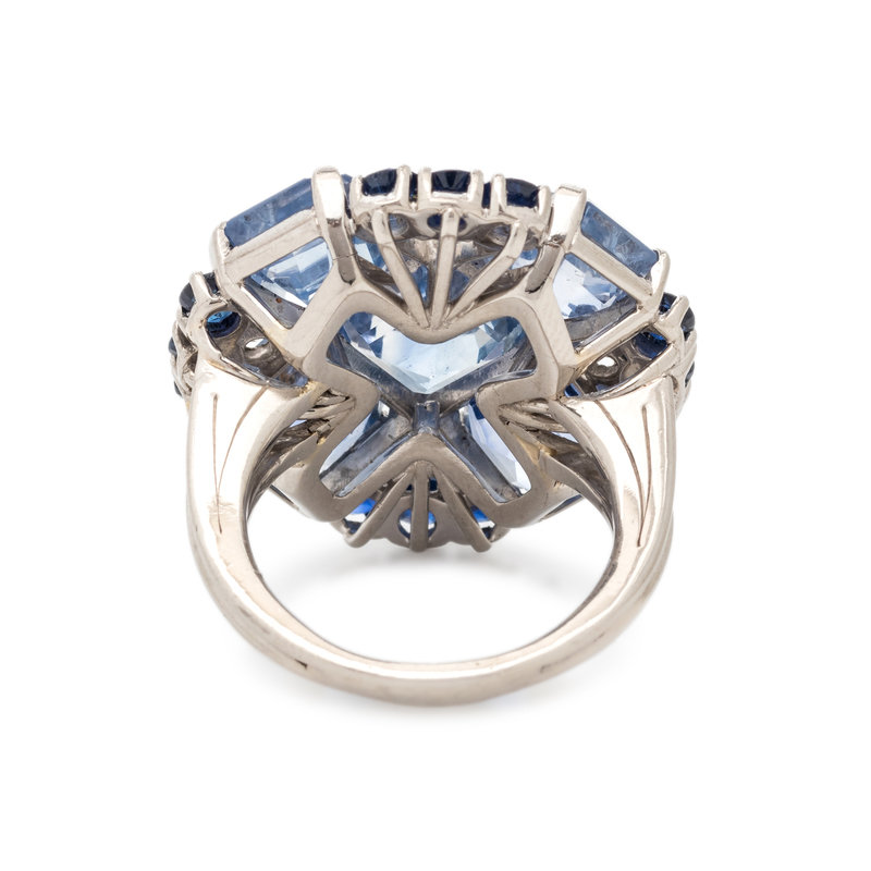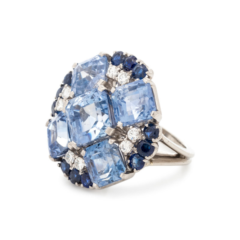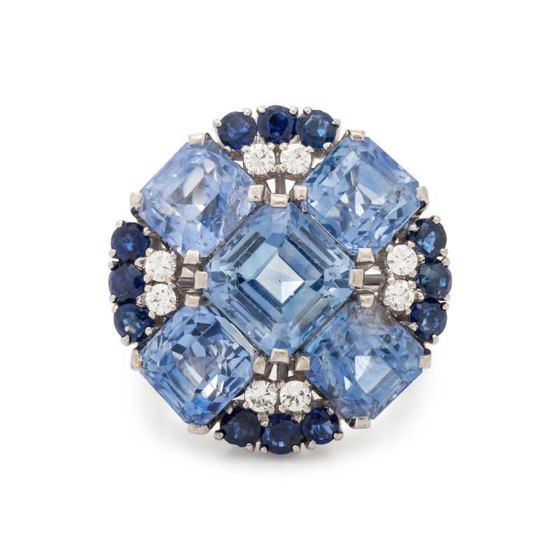 Unsigned, containing five emerald cut sapphires weighing approximately 17.00-18.00 carats total, eight round brilliant cut diamonds weighing approximately 0.30 carat total and 12 round mixed cut sapphires measuring approximately 2.50-3.00 mm in diameter. Mounted in platinum.