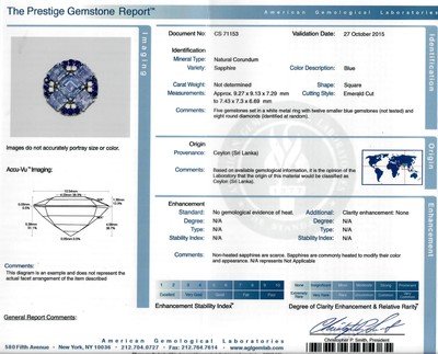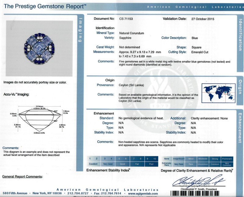 AGL, 2015, Report number CS71153, Natural Corundum, Sapphire, Ceylon (Sri Lanka), No evidence of heat